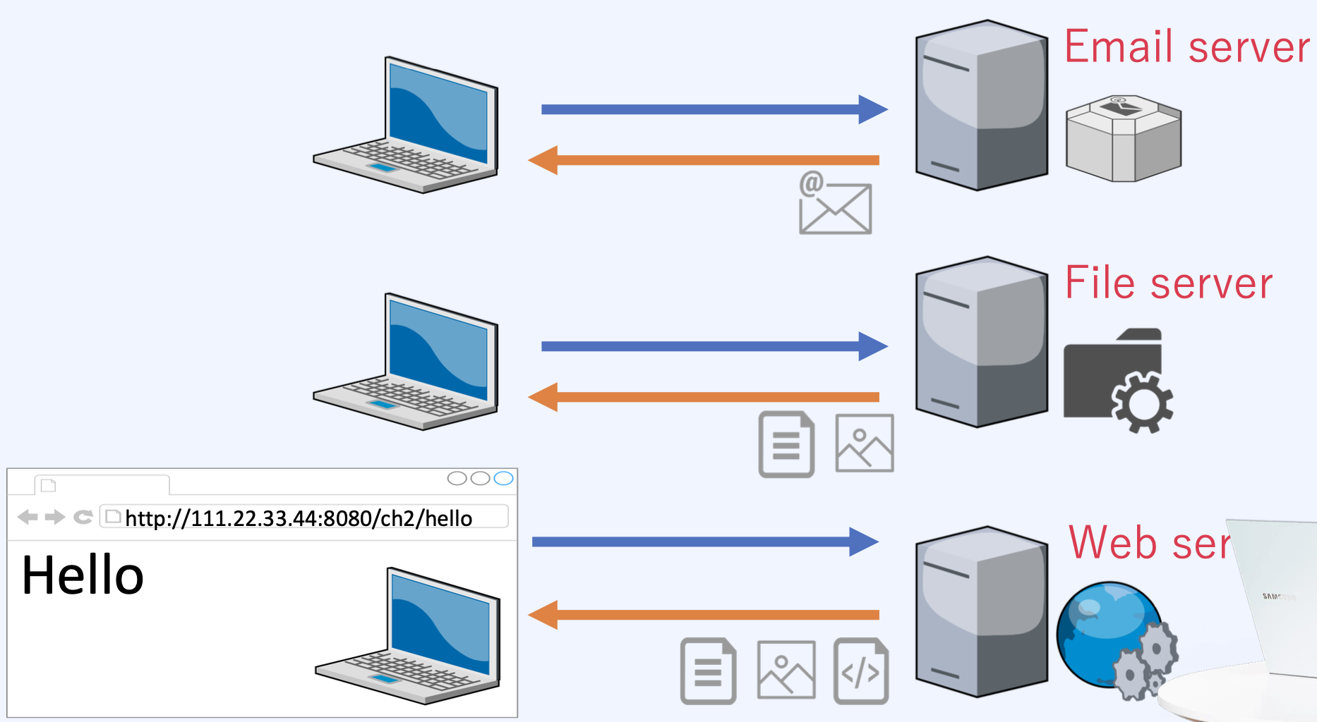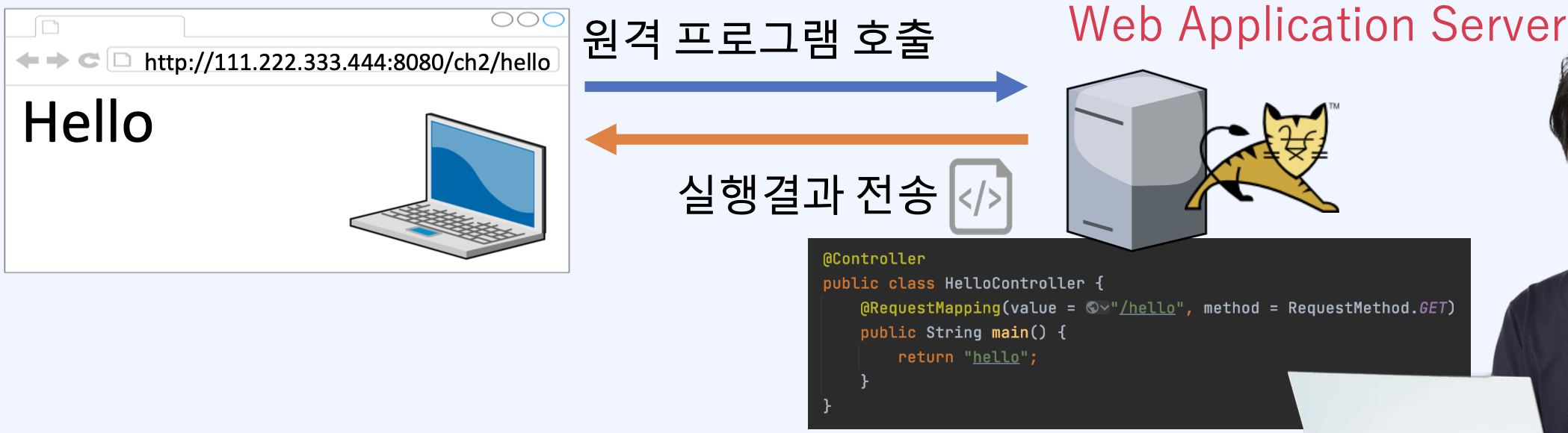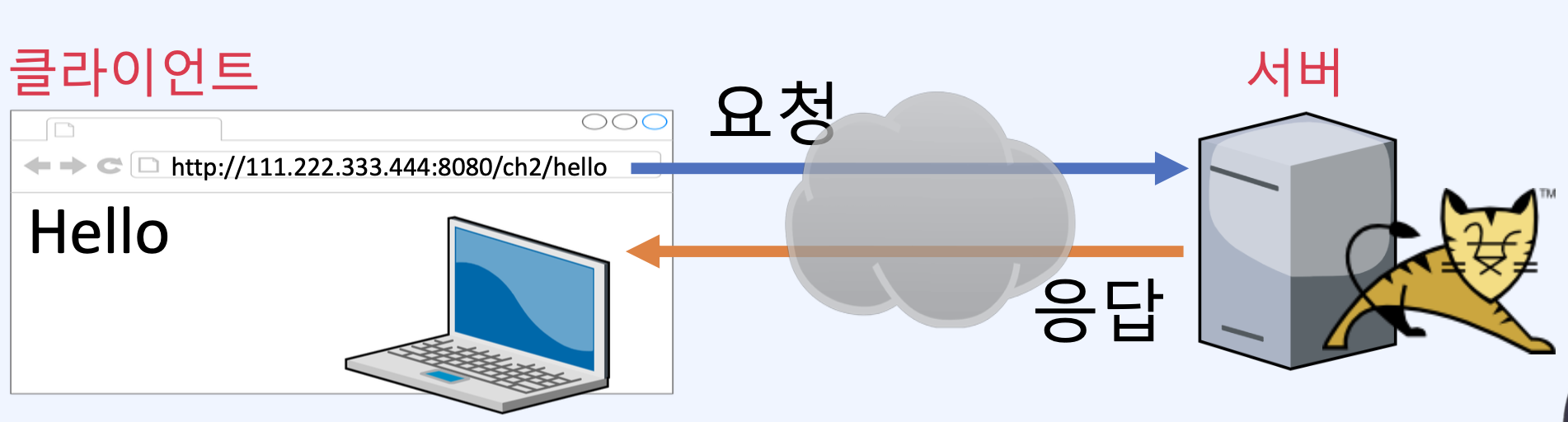 }http://111.222.333.444:8080/ch2/hello ๋ฅผ ํธ์ถํ๋ฉด hello์ ์ฐ๊ฒฐ๋ ๋ฉ์๋๊ฐ ํธ์ถ๋๋ค.