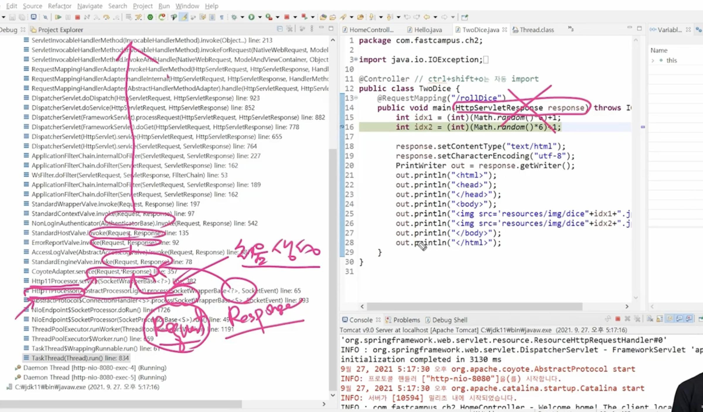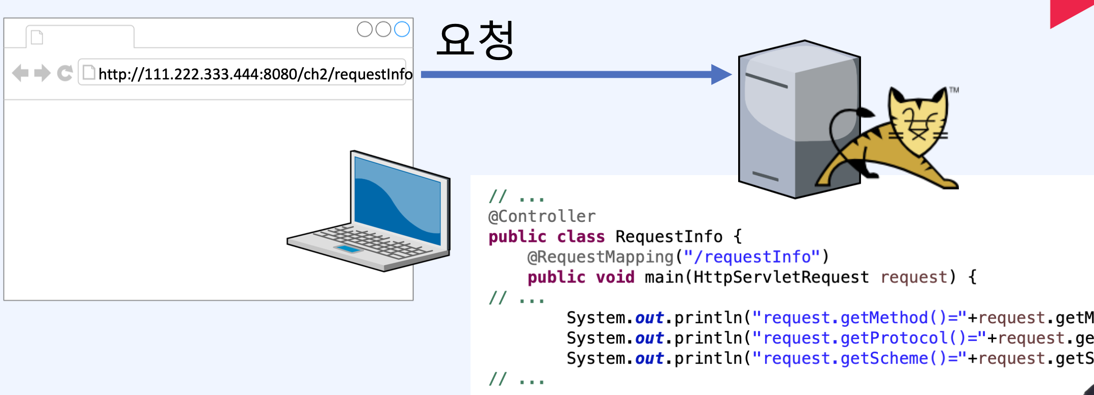 - ํฐ์บฃ์ด HttpServletRequset ๊ฐ์ฒด๋ฅผ ๋ง๋ ๋ค.