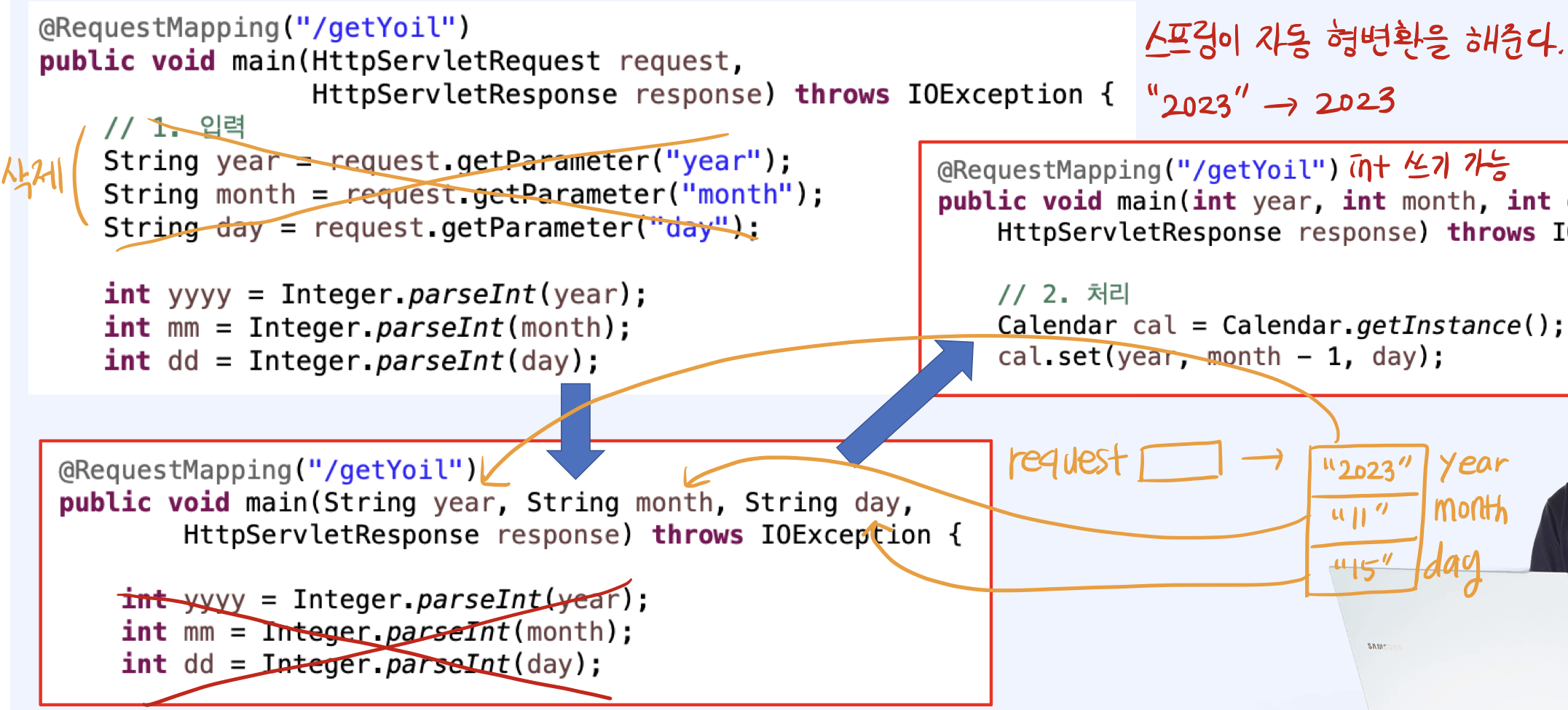 public String main(int year, int month, int day, Model model) // ๊ธฐ์กด