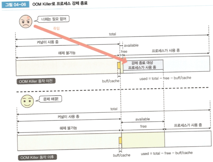 +) ๋ฉ๋ชจ๋ฆฌ ์ฉ๋์ ์ถฉ๋ถํ๋ฐ OOM Killer๊ฐ ๋์ํ๋ค๋ฉด ์ด๋ค ํ๋ก์ธ์ค ๋๋ ์ปค๋์ ๋ฉ๋ชจ๋ฆฌ ๋์(memeory leak)๊ฐ ์ผ์ด๋๊ณ ์์์ง๋ ๋ชจ๋ฅธ๋ค.