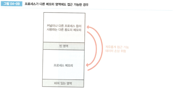 ์ด๋ค ํ๋ก์ธ์ค๊ฐ ์ปค๋์ด๋ ๋ค๋ฅธ ํ๋ก์ธ์ค์ ํ ๋น๋ ๋ฉ๋ชจ๋ฆฌ ์ฃผ์๋ฅผ ์ง์ ํ๋ฉด ์์ ์ด ์ฌ์ฉํ๋ ์์ญ์ด ์๋์๋ ๋ถ๊ตฌํ๊ณ ์ ๊ทผํ ์ ์๋ ๋ฌธ์ ๊ฐ ์๊น