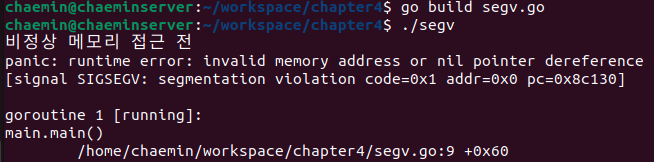 C์ธ์ด๋ Go ์ธ์ด์ฒ๋ผ ๋ฉ๋ชจ๋ฆฌ ์ฃผ์๋ฅผ ์ง์ ๋ค๋ฃจ๋ ์ธ์ด๋ก ์์ฑ๋ ํ๋ก๊ทธ๋จ์ด๋ผ๋ฉด SIGSEGV ๋๋ฌธ์ ํ๋ก๊ทธ๋จ์ด ๊ฐ์ ์ข ๋ฃ๋๋ ์ผ์ด ์ข ์ข ๋ฐ์ํ๋ค.(ํ์ด์ฌ์ ๋ฐ์ ์ํจ. ๋ฉ๋ชจ๋ฆฌ ์ฃผ์ ์ง์ ์ ๋ค๋ฃจ๊ธฐ ๋๋ฌธ.)