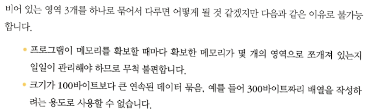 ์ ๊ทธ๋ฆผ์์ ๋น์ด์๋ ๋ฉ๋ชจ๋ฆฌ๋ ํฉ์น๋ฉด 300๋ฐ์ดํธ์ด์ง๋ง ๊ฐ์ ๋ฐ๋ก๋ฐ๋ก 100๋ฐ์ดํธ์ฉ 3๊ฐ์ ์์ญ์ผ๋ก ๋๋ ์ ธ์๊ธฐ ๋๋ฌธ์ 100๋ฐ์ดํธ๋ณด๋ค ํฐ ์์ญ์ ํ๋ณดํ๋ ค๋ฉด ์คํจํ๋ค.