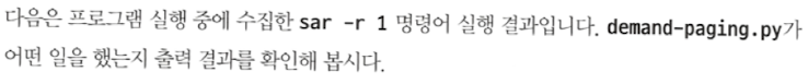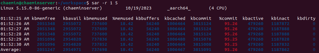 sar -r 1 5 : 5์ด๋์ 1์ด ๊ฐ๊ฒฉ์ผ๋ก ๋ฉ๋ชจ๋ฆฌ ์ ๋ณด๋ฅผ ์ถ๋ ฅํ๋ค.