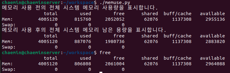 - memuse.py ์คํ ์งํ์ free ์คํ ์ used๊ฐ์ด ์ด์ ๊ณผ ๊ฑฐ์ ๊ฐ์์ ํ์ธํ ์ ์์