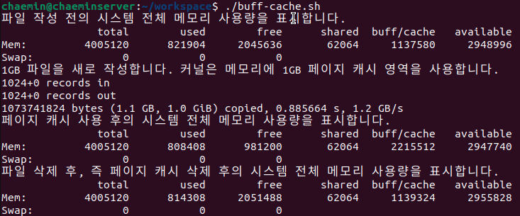 #!/bin/bash echo "ํ์ผ ์์ฑ ์ ์ ์์คํ ์ ์ฒด ๋ฉ๋ชจ๋ฆฌ ์ฌ์ฉ๋์ ํ์ํฉ๋๋ค." free echo "1GB ํ์ผ์ ์๋ก ์์ฑํฉ๋๋ค. ์ปค๋์ ๋ฉ๋ชจ๋ฆฌ์ 1GB ํ์ด์ง ์บ์ ์์ญ์ ์ฌ์ฉํฉ๋๋ค." dd if=/dev/zero of=testfile bs=1M count=1K echo "ํ์ด์ง ์บ์ ์ฌ์ฉ ํ์ ์์คํ ์ ์ฒด ๋ฉ๋ชจ๋ฆฌ ์ฌ์ฉ๋์ ํ์ํฉ๋๋ค." free echo "ํ์ผ ์ญ์ ํ, ์ฆ ํ์ด์ง ์บ์ ์ญ์ ํ์ ์์คํ ์ ์ฒด ๋ฉ๋ชจ๋ฆฌ ์ฌ์ฉ๋์ ํ์ํฉ๋๋ค." rm testfile free