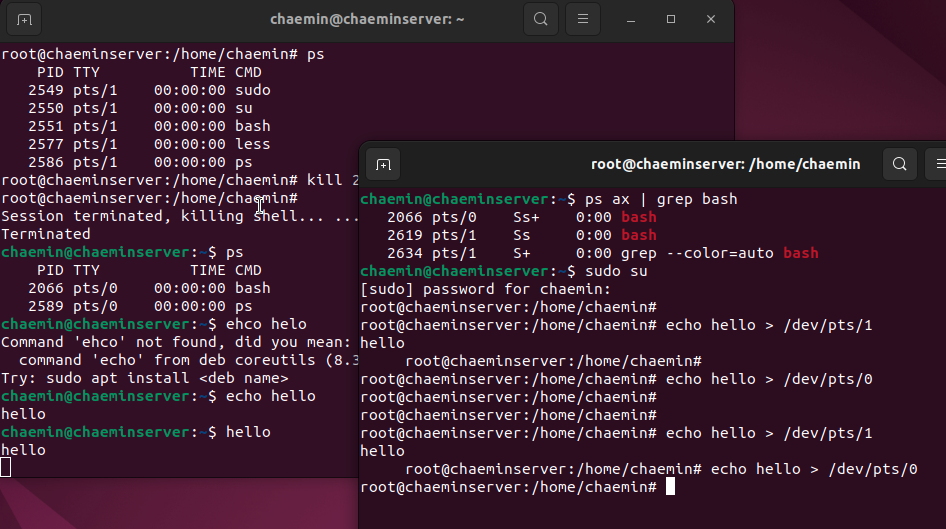 ๊ทธ ์ด์ ๋ echo ๋ช ๋ น์ด๋ ํ์ค ์ถ๋ ฅ์ hello๋ฅผ ์ฐ๊ณ , ๋ฆฌ๋ ์ค์์ ํ์ค ์ถ๋ ฅ์ ๋จ๋ง๊ณผ ์ฐ๊ฒฐ๋์ด ์๊ธฐ ๋๋ฌธ.