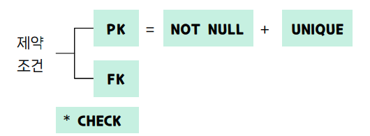 | CHECK | ๊ฐ ํ์ด ๋ง์กฑํด์ผ ํ๋ ์กฐ๊ฑด ์ ์, ์กฐ๊ฑด์ ๋ง์กฑํ์ง ๋ชปํ๋ ๋ฐ์ดํฐ๋ INSERT, UPDATE ๋ถ๊ฐ๋ฅ |