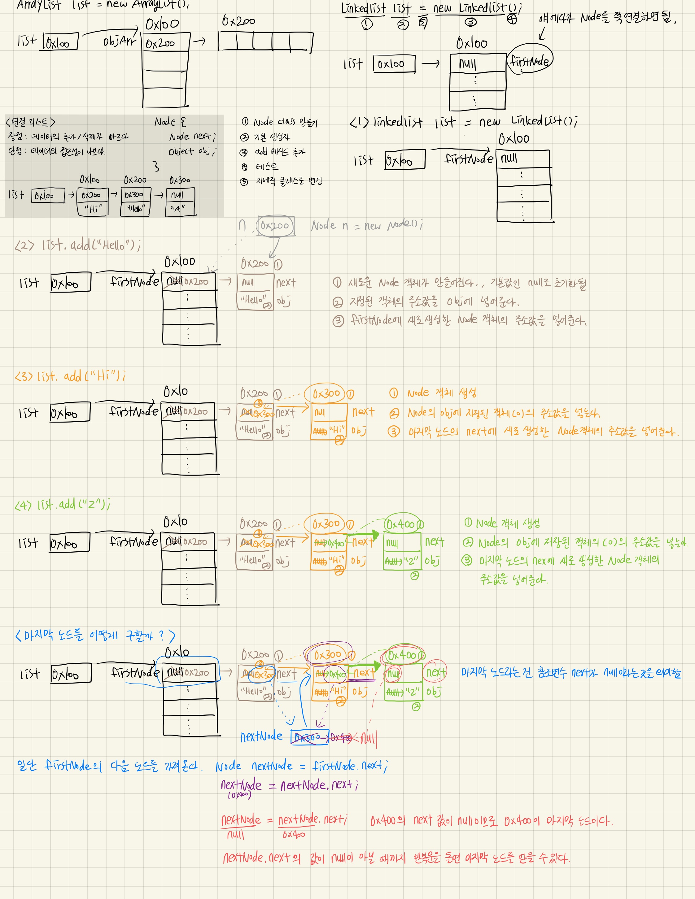 /** * 1. Node class ๋ง๋ค๊ธฐ * 2. ๊ธฐ๋ณธ ์์ฑ์ * 3. add ๋ฉ์๋ ์ถ๊ฐ * 4. ํ ์คํธ * 5. ์ง๋ค๋ฆญ ํด๋์ค๋ก ๋ณ๊ฒฝ */ public class MyLinkedList { private class Node { Node next; // ๋ค์ ๋ ธ๋ Object obj; // ๊ฐ private Node(Object obj) { this.obj = obj; } @Override public String toString() { return obj + ""; } } public MyLinkedList() {} private Node firstNode; /** * ๋ฉ์๋๋ช : add * ๊ธฐ๋ฅ : ์ง์ ๋ ๊ฐ์ฒด(o)๋ฅผ ๋ฆฌ์คํธ์ ๋์ ์ถ๊ฐ * ๋ฐํ๊ฐ : ์์ * ๋งค๊ฐ๋ณ์ : Object o */ public void add(Object o) { Node newNode = new Node(o); // Node๊ฐ์ฒด๋ฅผ ์์ฑํ๊ณ , Node์ obj์ ์ ์ฅ๋ ๊ฐ์ฒด(o)์ ์ฃผ์๊ฐ์ ๋ฃ๋๋ค. if (firstNode == null) { firstNode = newNode; // ์ฒซ ๋ฒ์งธ ๋ ธ๋์ผ ๊ฒฝ์ฐ ๊ฐ๋ง ๋ฃ์ด์ฃผ๊ณ ๋๋ } else { Node lastNode = getLastNode(); // ๋ง์ง๋ง ๋ ธ๋๋ฅผ ๊ฐ์ ธ์จ๋ค. lastNode.next = newNode; // ๋ง์ง๋ง ๋ ธ๋์ next์ ์๋ก ์์ฑํ Node ๊ฐ์ฒด์ ์ฃผ์๊ฐ์ ๋ฃ์ด์ค๋ค. } } /** * ๋ฉ์๋๋ช : getLastNode * ๊ธฐ๋ฅ : ๋ง์ง๋ง ๋ ธ๋๋ฅผ ๋ฐํํ๋ค. * ๋ฐํ๊ฐ : Node * ๋งค๊ฐ๋ณ์ : ์์ */ private Node getLastNode() { Node nextNode = firstNode.next; // nextNode๊ฐ null์ด๋ผ๋ ๊ฒ์ ์ฐ๊ฒฐ๋์ด์๋ node๊ฐ ํ๋๋ฟ์ด๋ผ๋ ๋ป. // ํ๋๋ฐ์ ์์ผ๋๊น firstNode๊ฐ lastNode์ด๋ฏ๋ก firstNode๋ฅผ ๋ฐํํด์ค๋ค. if (nextNode == null) return firstNode; // ๋ง์ง๋ง ๋ ธ๋๋ผ๋ ๊ฒ์ ์ฐธ์กฐ๋ณ์์ next์ ๊ฐ์ด null์ด๋ผ๋ ๊ฒ์ ์๋ฏธํจ. // nextNode.next์ ๊ฐ์ด null์ด ์๋ ๋๊น์ง ๋ฐ๋ณต๋ฌธ์ ๋๋ฉด ๋ง์ง๋ง ๋ ธ๋๋ฅผ ์ป์ ์ ์๋ค. while (nextNode.next != null) { nextNode = nextNode.next; } return nextNode; } @Override public String toString() { if (firstNode == null) return ""; // ์ฐ๊ฒฐ๋์ด์๋ Node๊ฐ ์์ผ๋ฉด ๊ณต๋ฐฑ ๋ฐํ String tmp = firstNode + ""; // ๋งํฌ๋ ๋ฆฌ์คํธ์ ์ฐ๊ฒฐ๋์ด์๋ ๋ชจ๋ obj ๊ฐ์ ๋ํ๊ธฐ ์ํ ๋ณ์ Node nextNode = firstNode.next; // nextNode๊ฐ null์ด๋ผ๋ ๊ฒ์ ์ฐ๊ฒฐ๋์ด์๋ node๊ฐ ํ๋ ๋ฟ์ด๋ผ๋ ๋ป. ํ๋๋ฐ์ ์์ผ๋๊น firstNode์ obj๊ฐ๋ง ๋ฐํํด์ค๋ค. if (nextNode == null) return tmp; tmp += (", " + nextNode); while (nextNode.next != null) { nextNode = nextNode.next; tmp += (", " + nextNode); } return tmp; } }