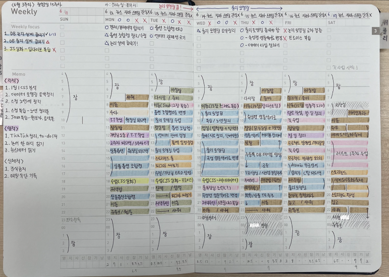 구분 목표시간 사용시간 달성률% 원인분석 다음 주에 적용할 것 🧘♀️영적 ✏️지적 사회적 🏃♀️신체적 🌔잠 🚿기타